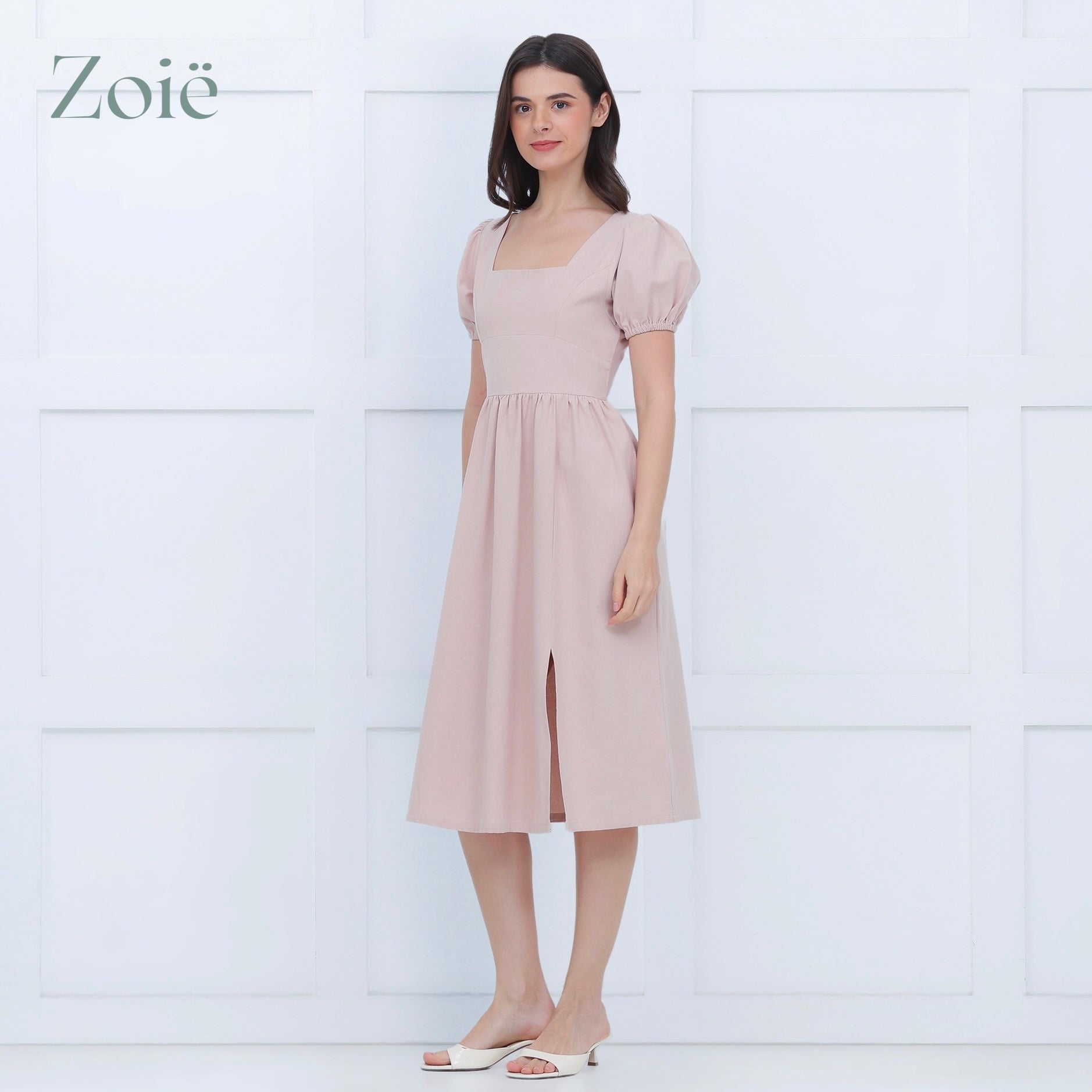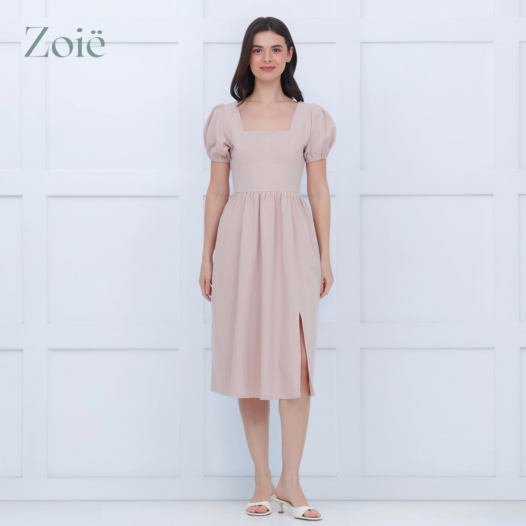 Square neck gartered sleeves dress with lining. Gartered back. Zip opening. Side front slit.