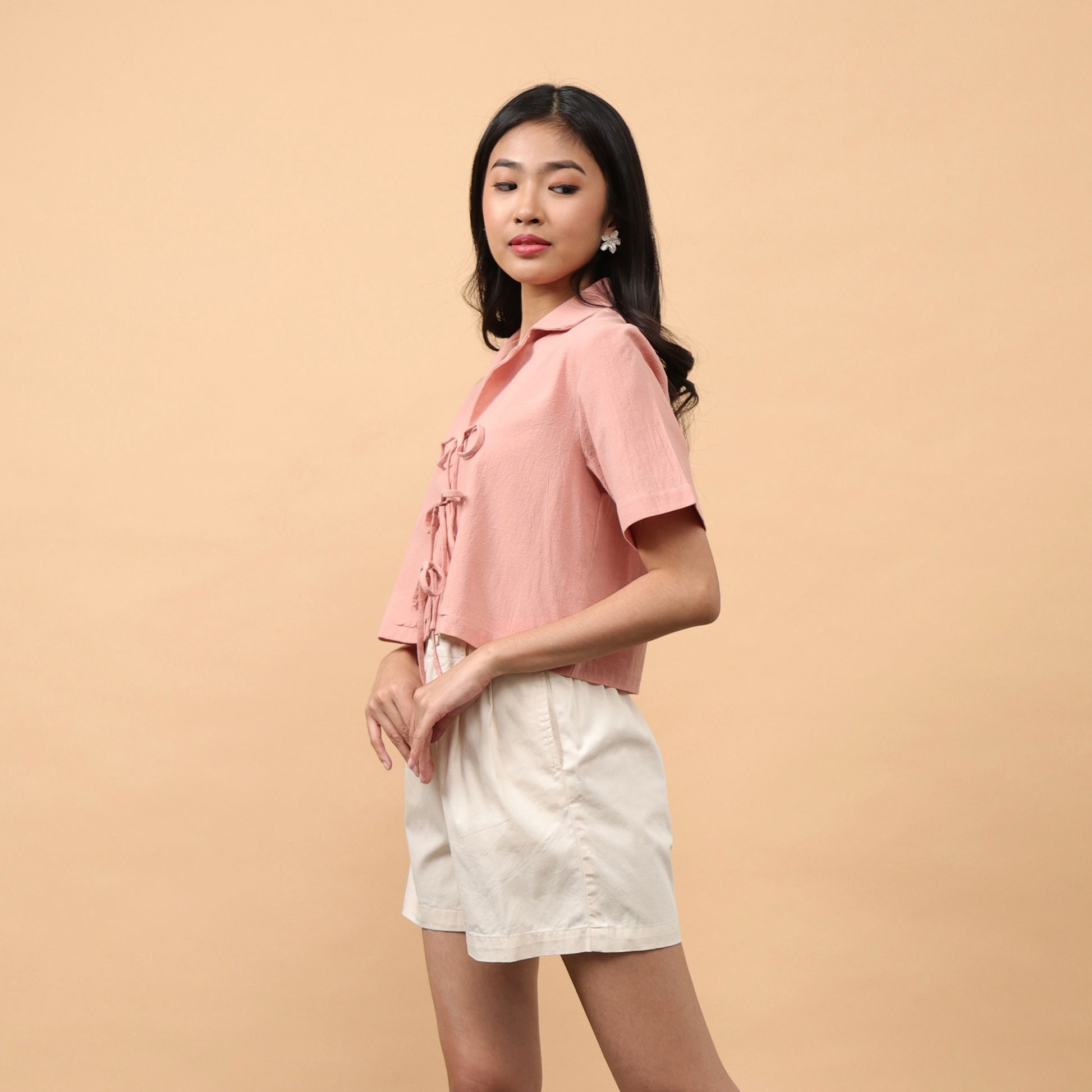 Short sleeves cropped top. With collar. Front ties closure.