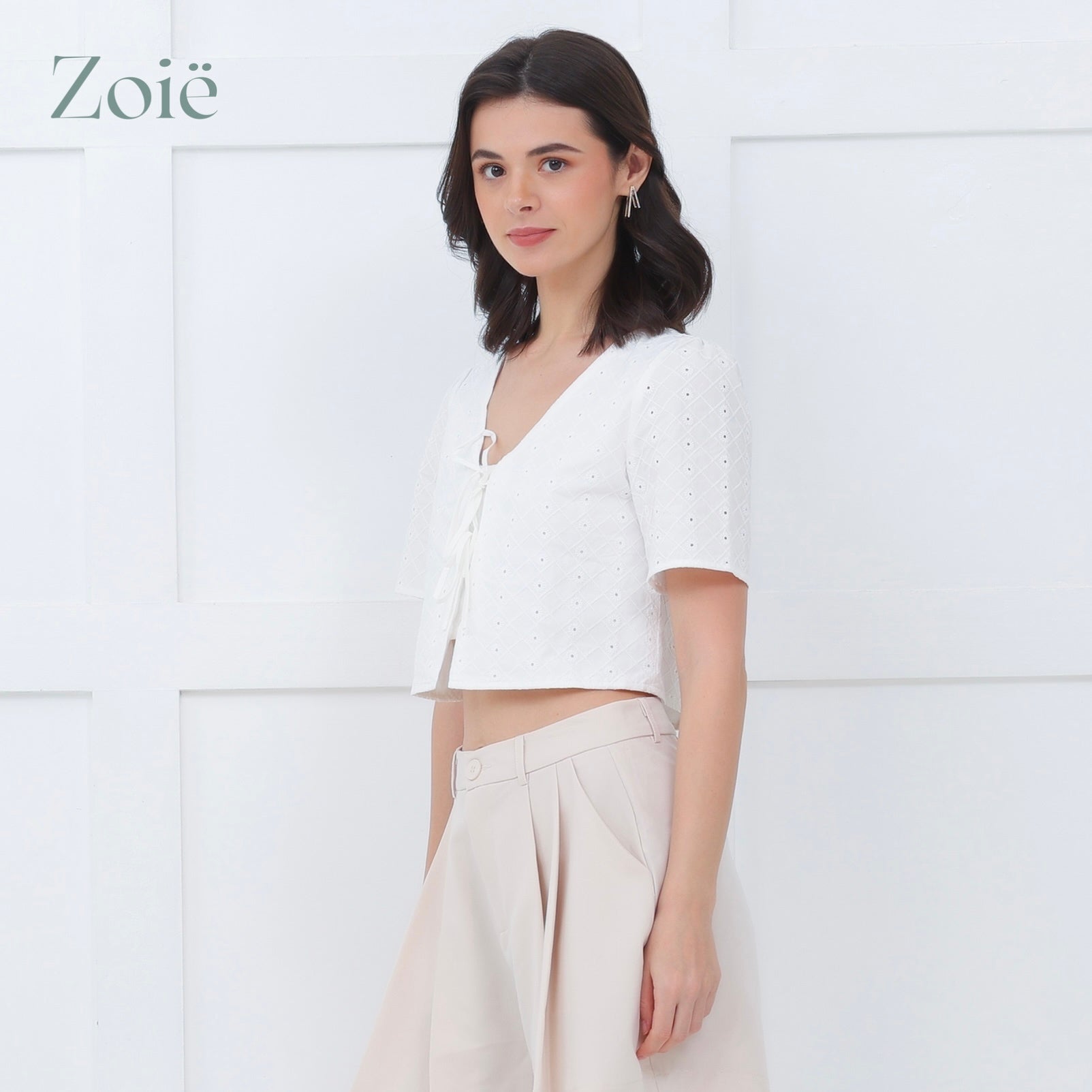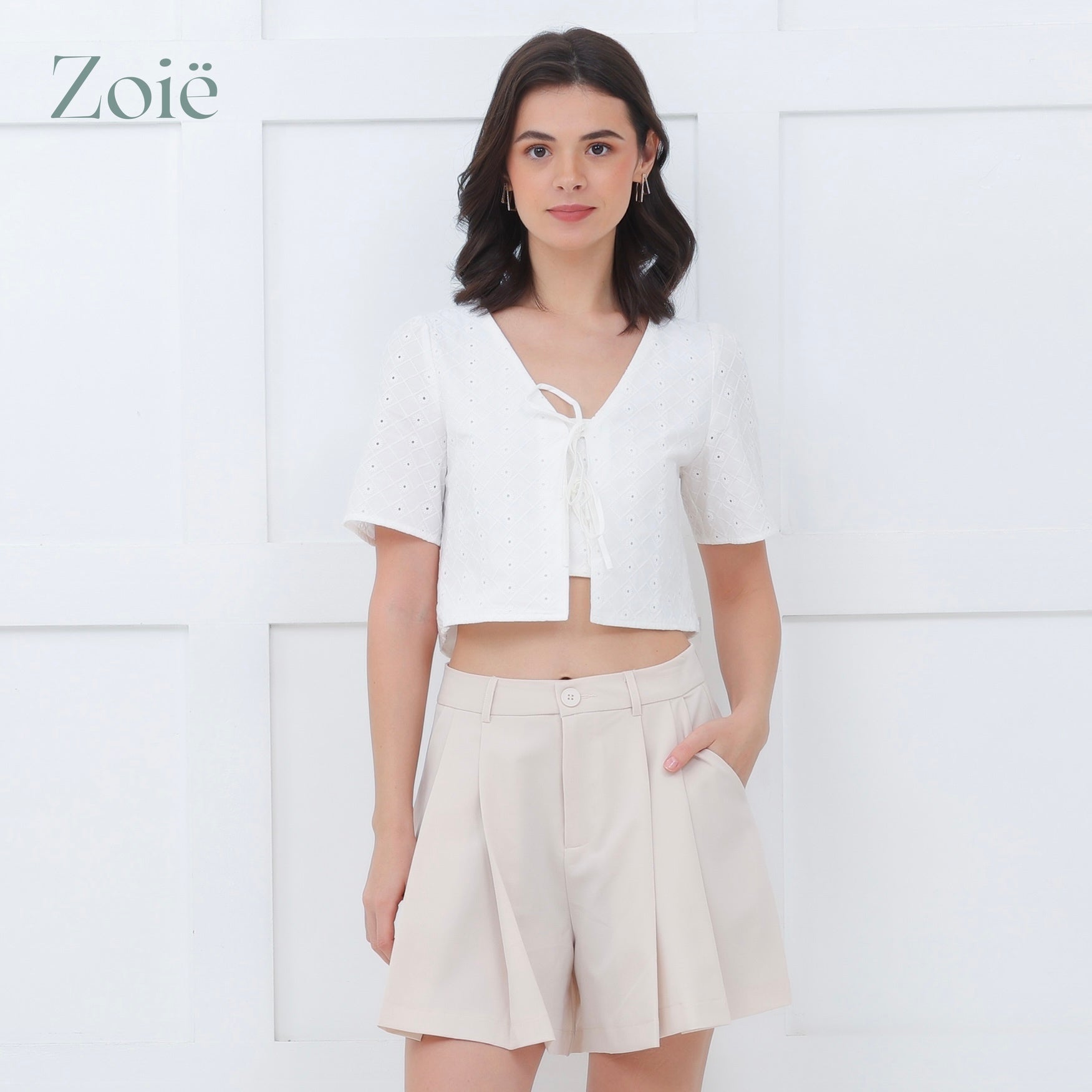 Short sleeves v-neck top. Hidden button center flap. Front ties closure.