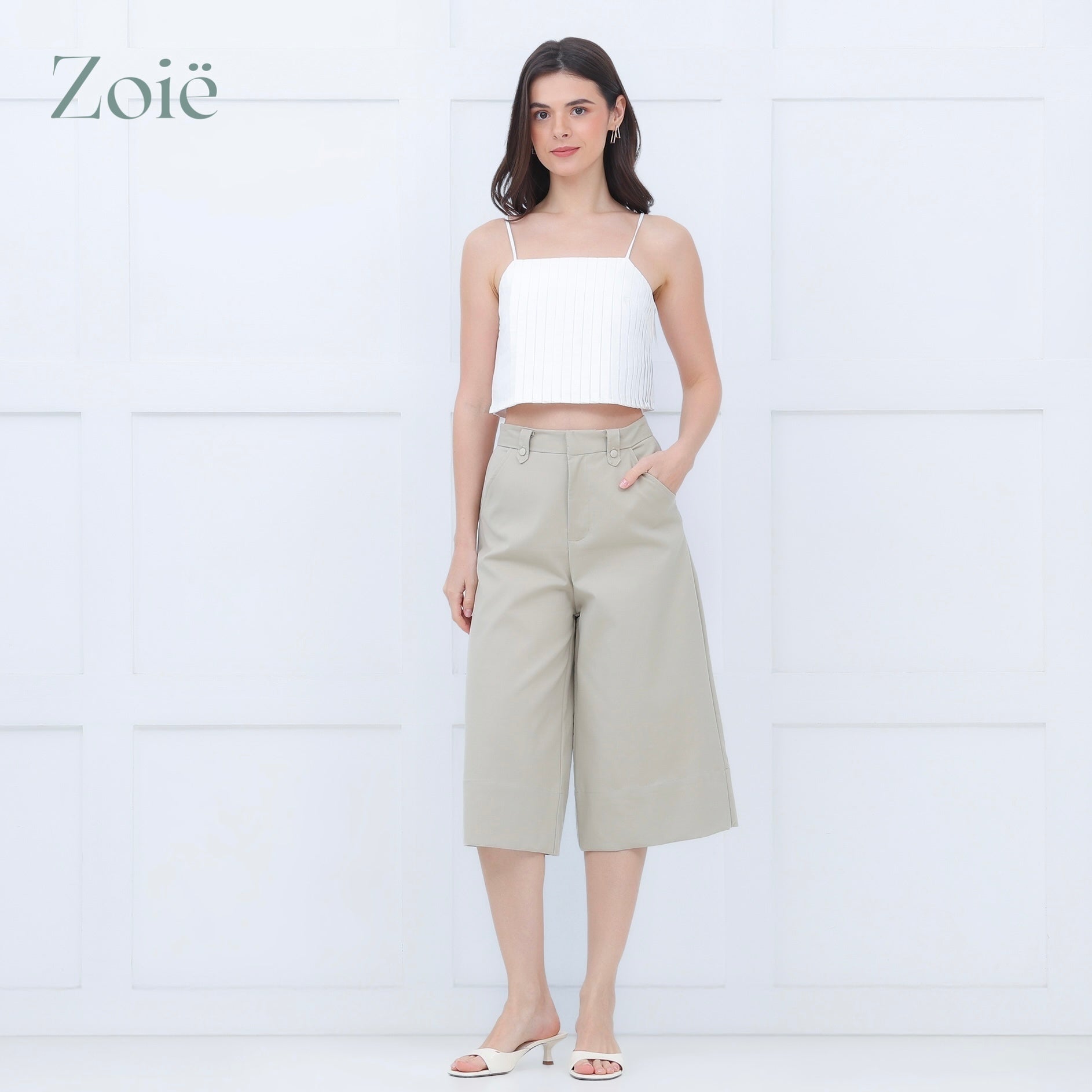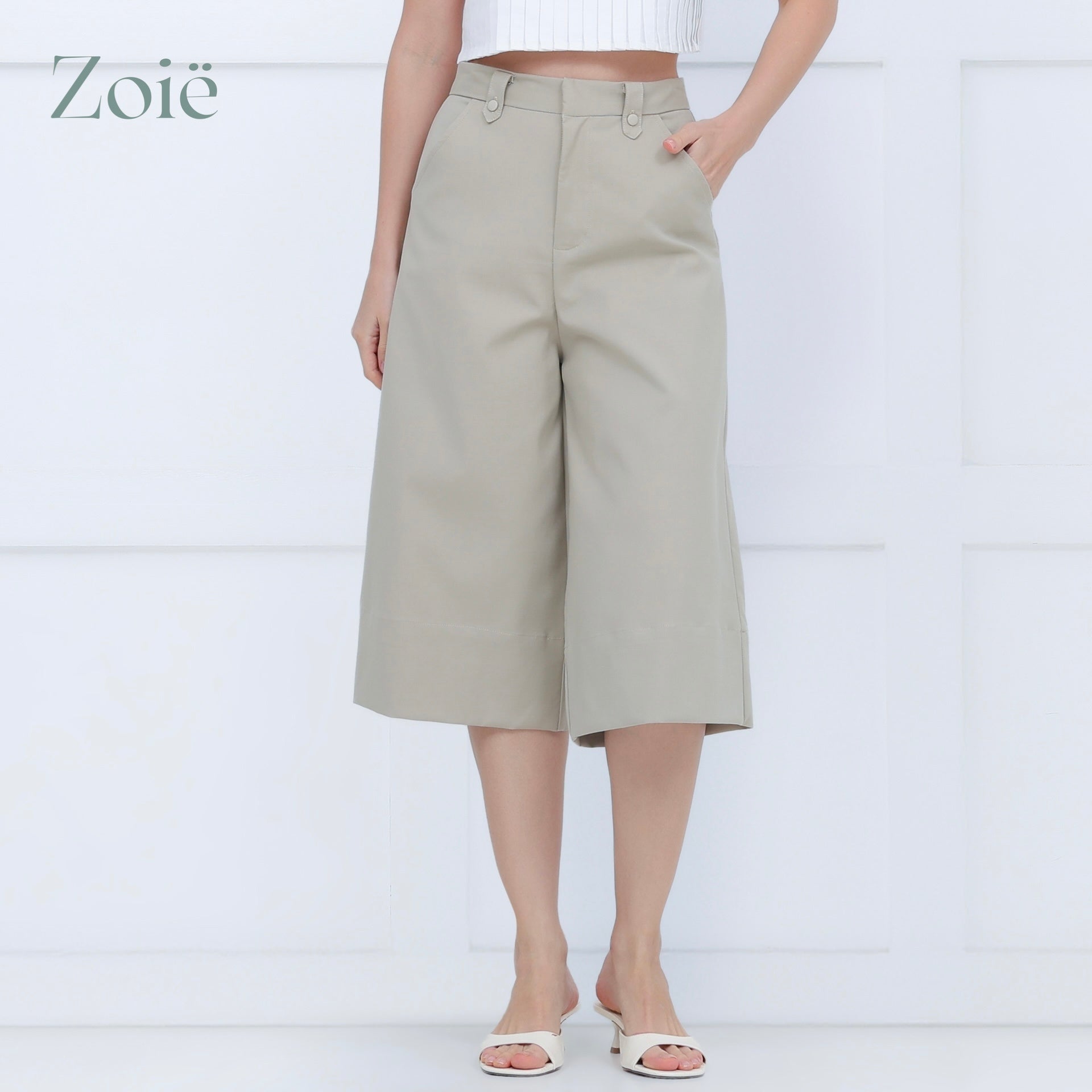 Culottes. Hook & eye/zip opening. Covered buttons on belt loops. Slide pockets. Back middle gartered waist. Back patch pockets.
