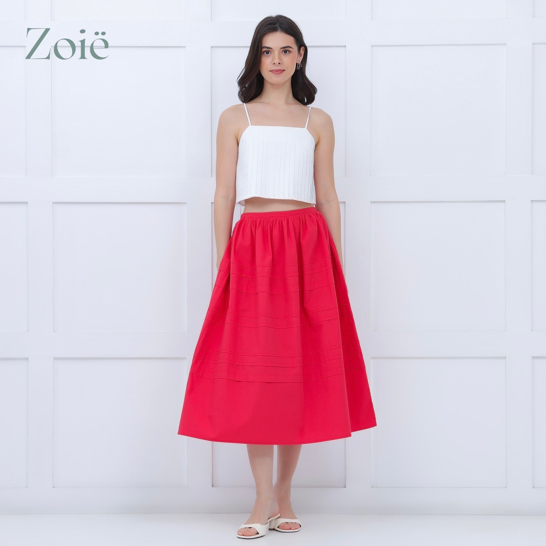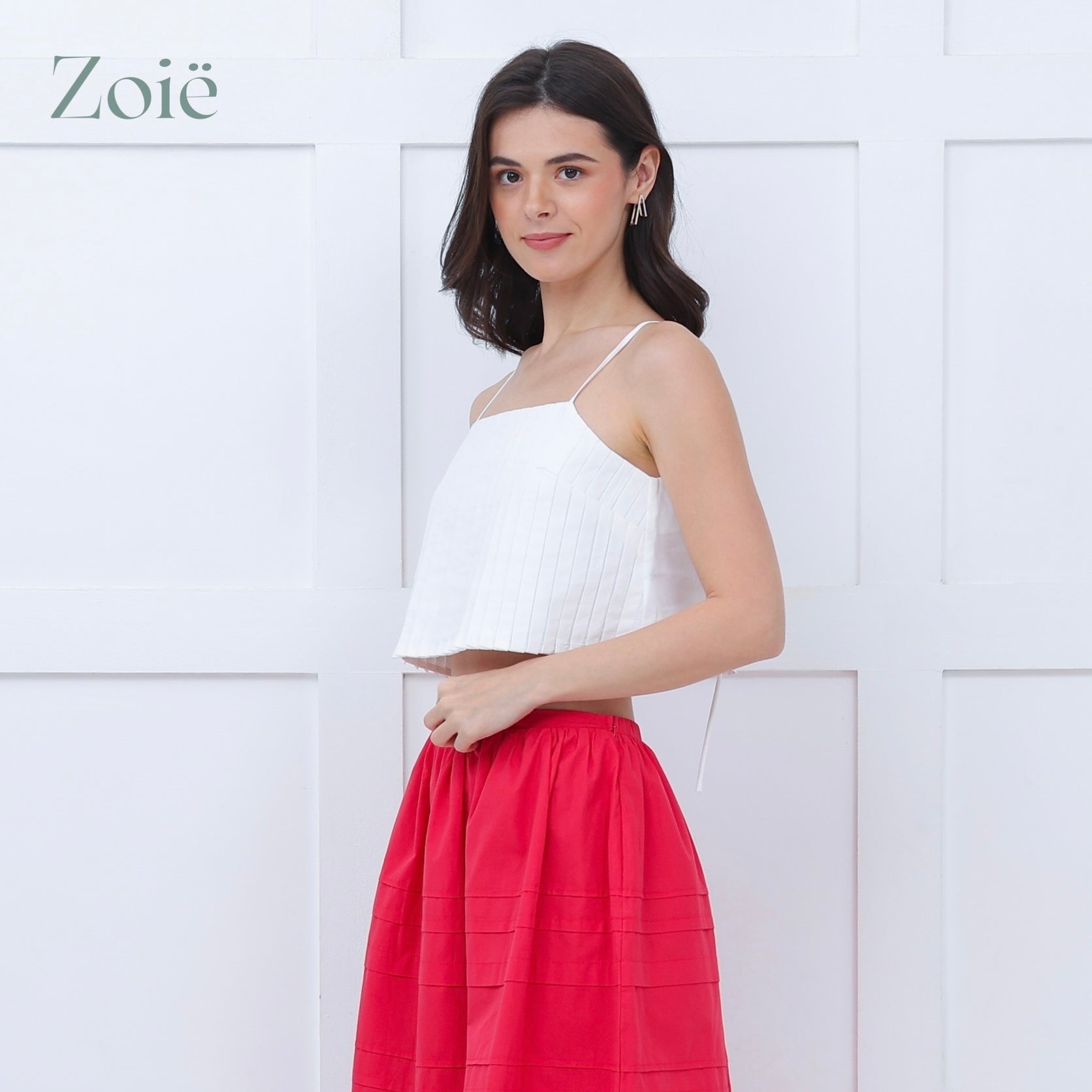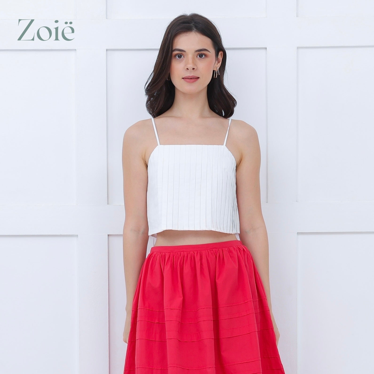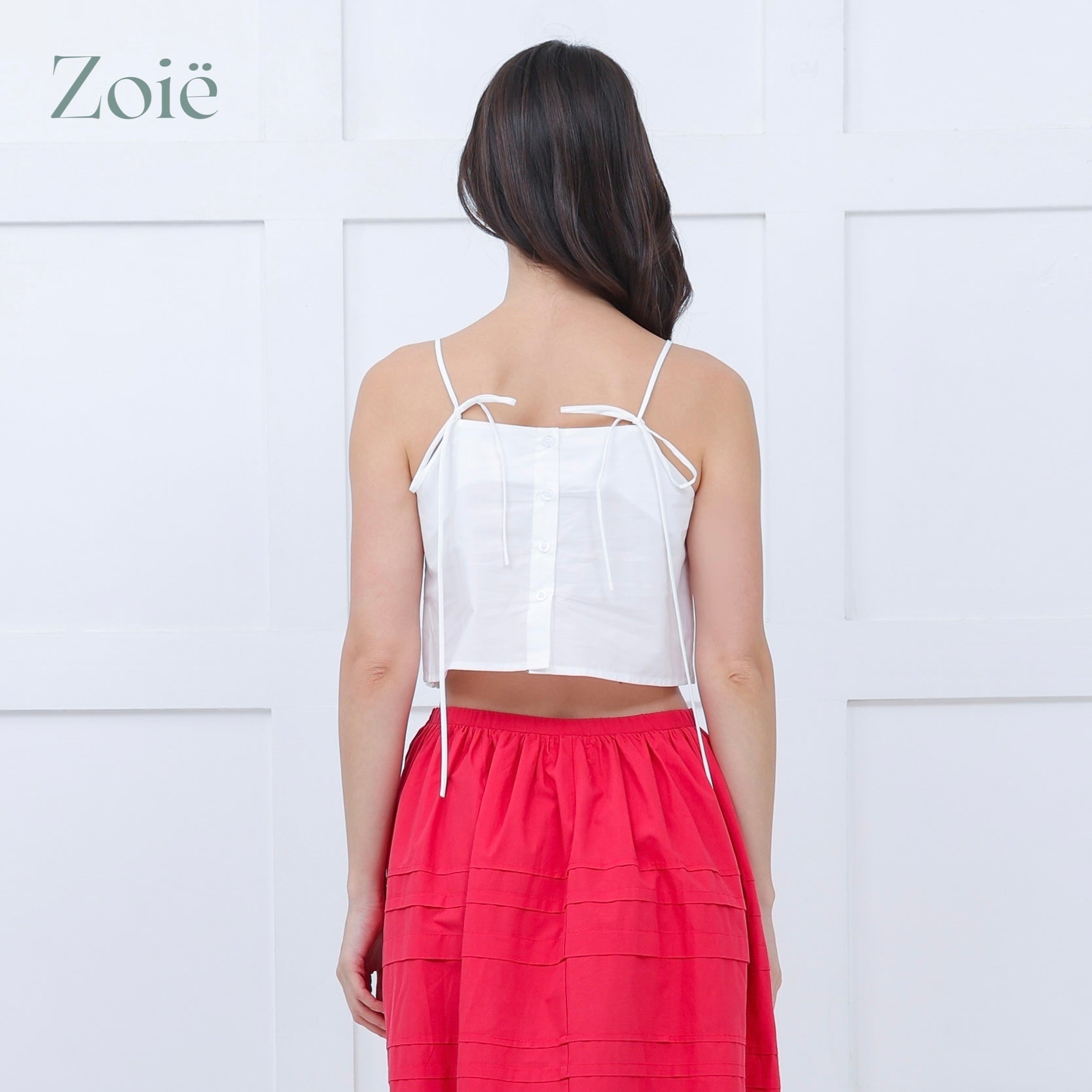 Pleated front top with loose spaghetti straps. Back button opening.