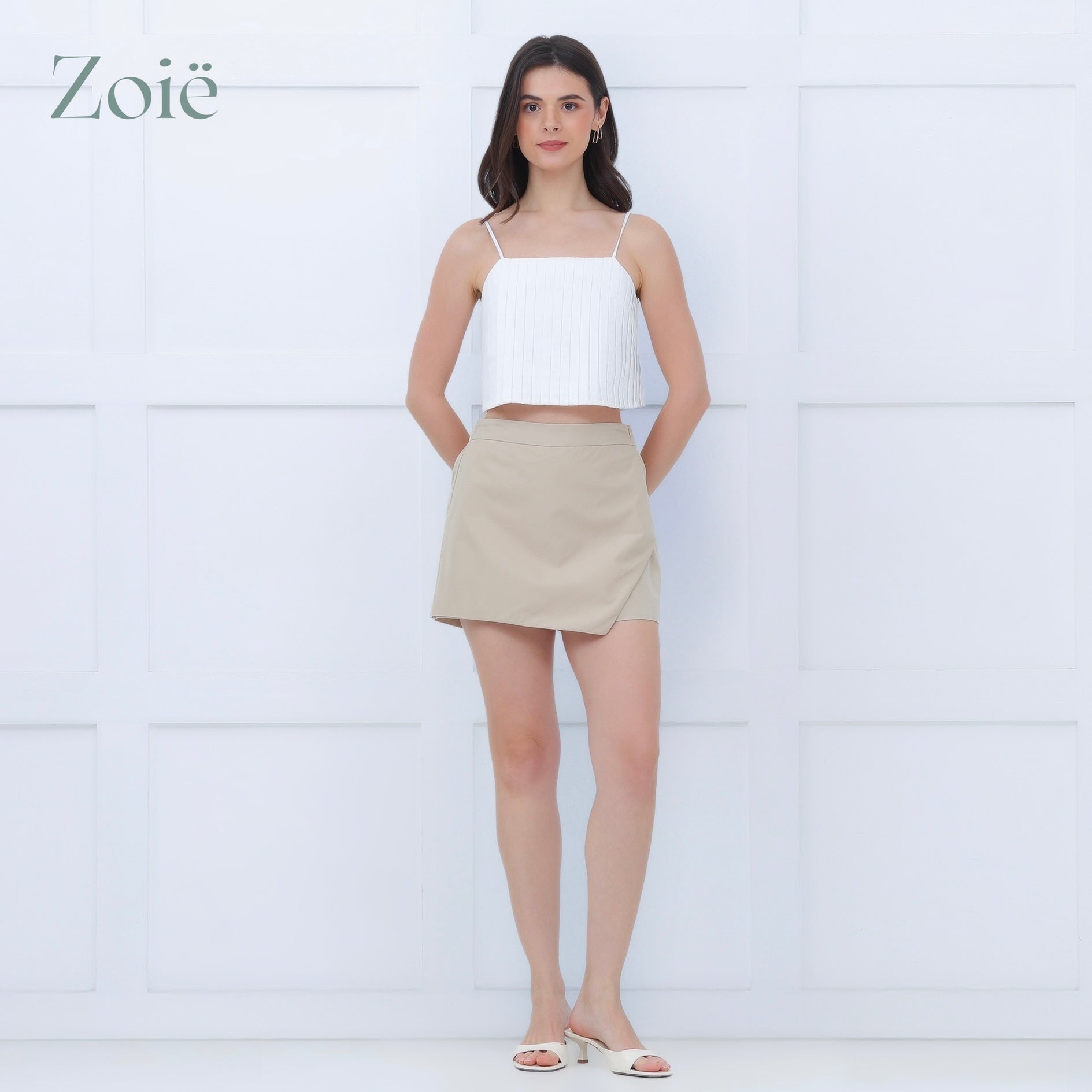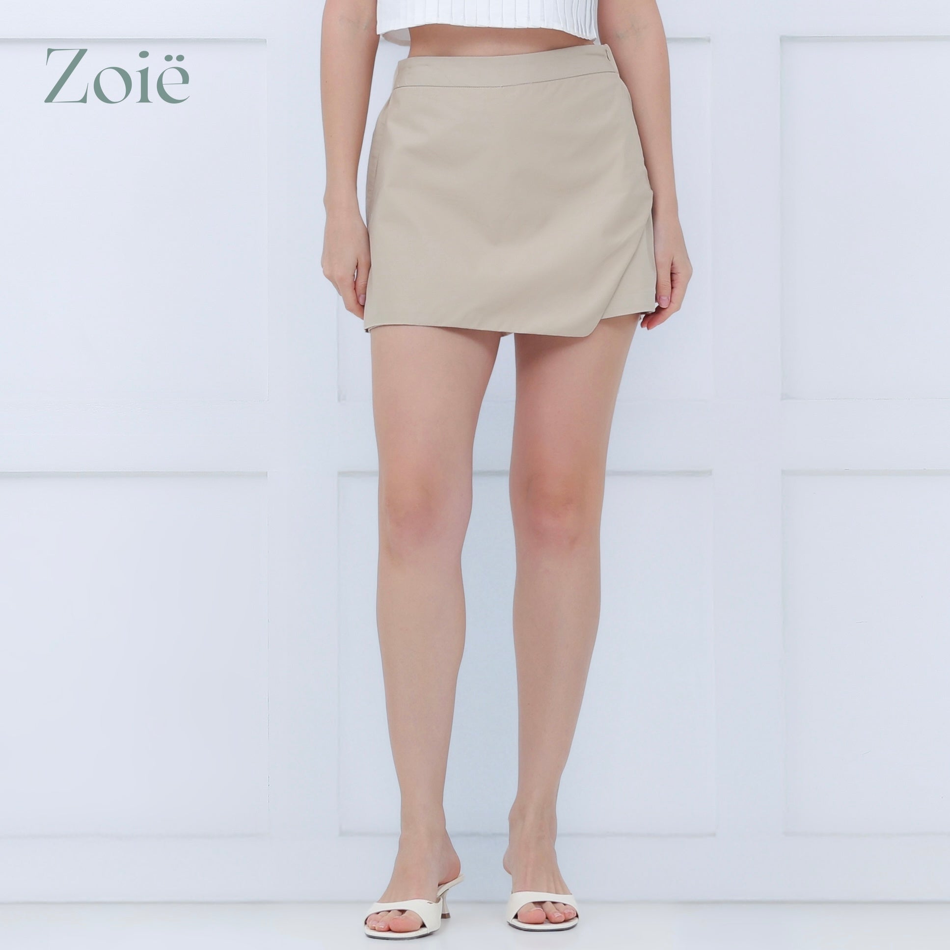 Shorts with front overlap. Side zip opening. Back gartered waist. Back welts. No side pockets.