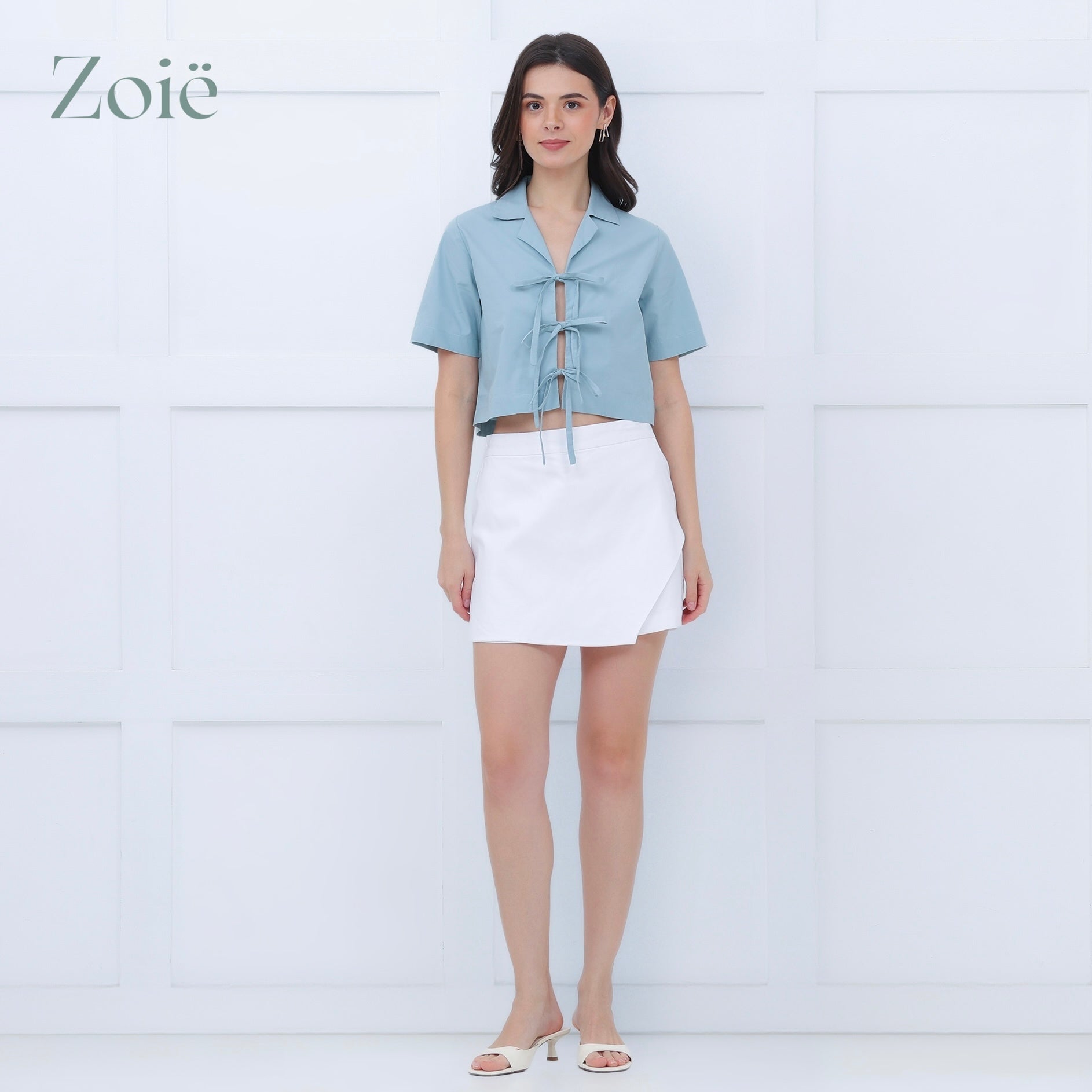 Shorts with front overlap. Side zip opening. Back gartered waist. Back welts. No side pockets.