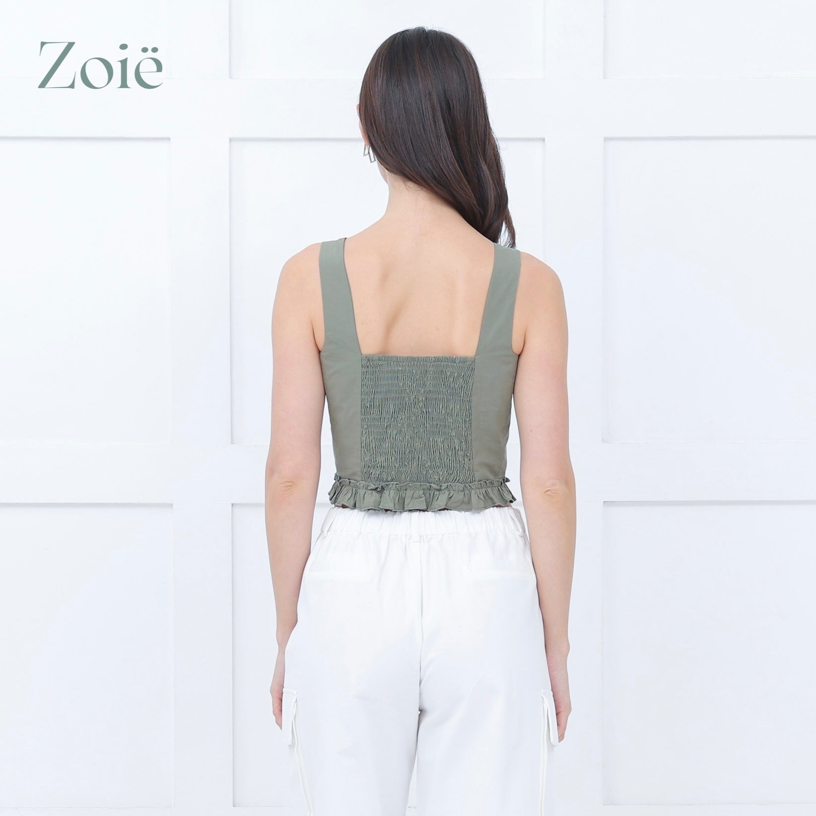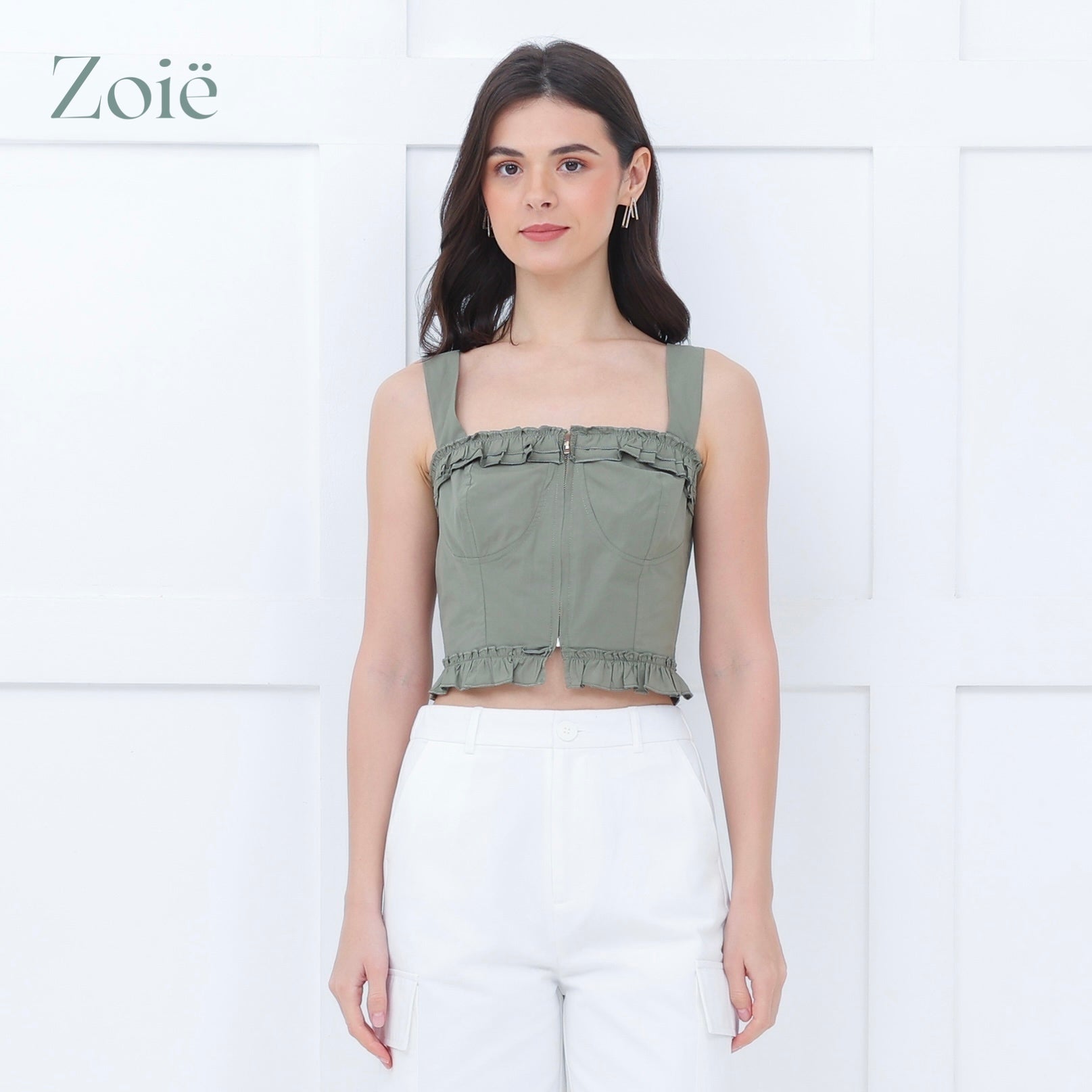 Cropped strap top. Doubled ruffled chest & hem. Back smock. Front zipper opening.