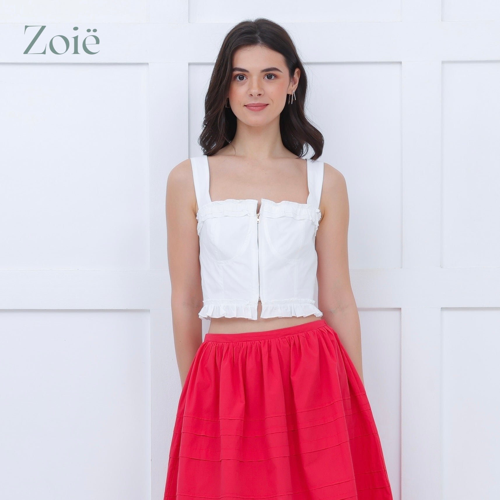 Cropped strap top. Doubled ruffled chest & hem. Back smock. Front zipper opening.