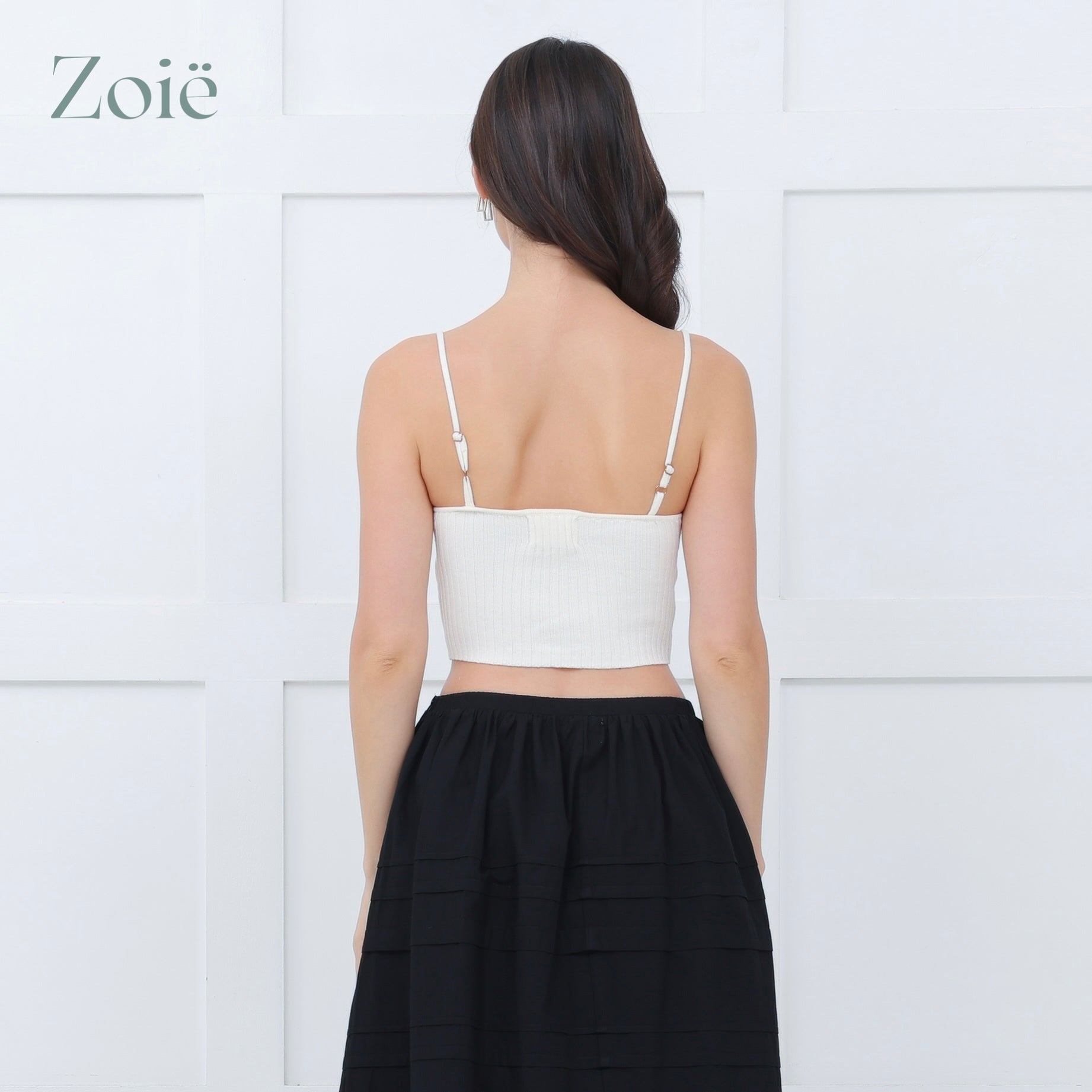 Ribbed knit bustier top with adjustable straps & hole on center chest.
